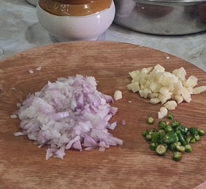 Heat oil in a pan. Add cumin seeds. When the seeds start crackling, add chopped garlic. Saute for few seconds till the garlic turns fragrant.