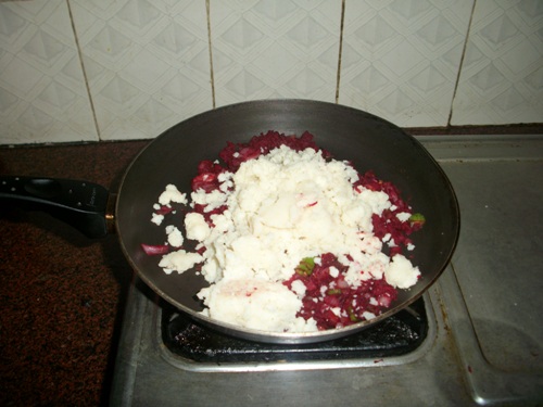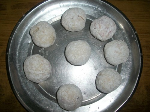 Pour this in mashed potatoes and blend well. Divide it into equal portions. Shape it into balls.