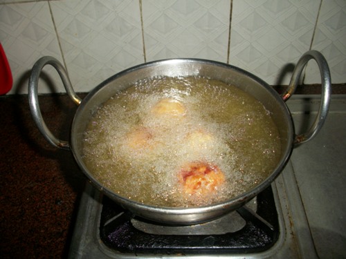 Heat oil for deep frying. Drop balls in, and fry till golden.