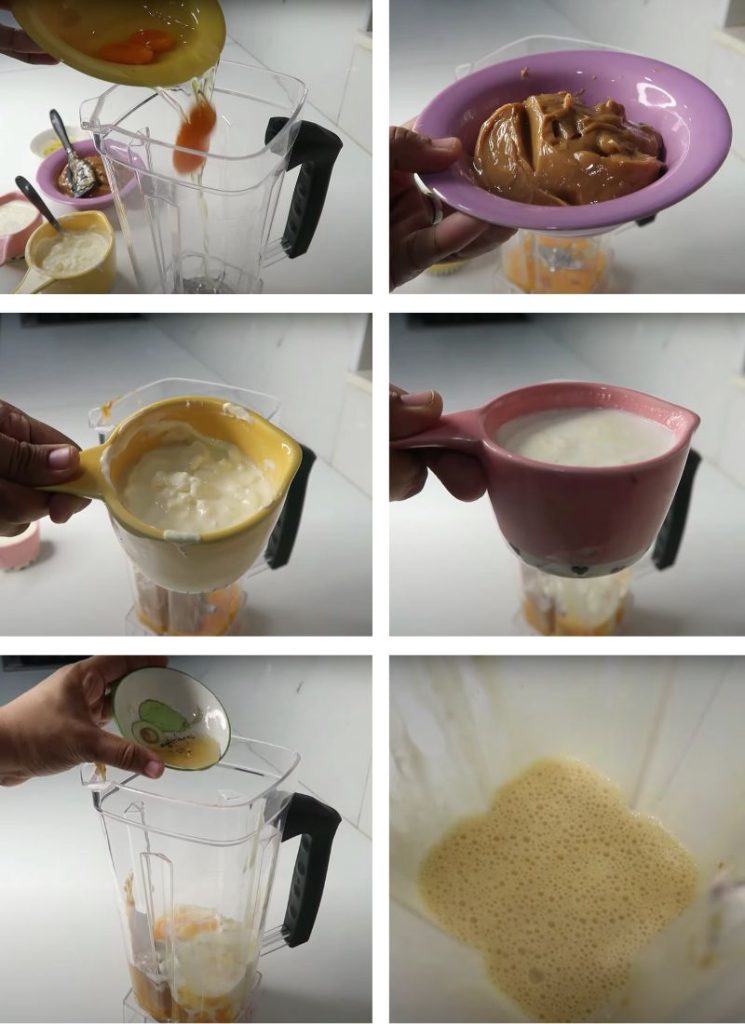 Now take all ingredients in a blender and mix till creamy. Pour this into the pan over the caramel.