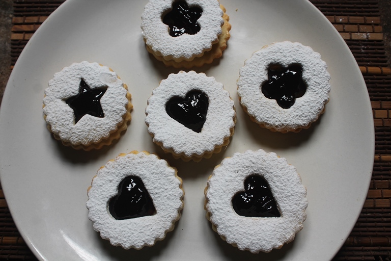 Linzer kekse (German: Linzer Augen, “Linzer eyes”) or Linzer tarts are a sandwich cookie version, topped with a layer of dough with a characteristic circle shaped cut-out exposing the fruit preserves, and dusted with confectioner’s sugar.