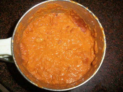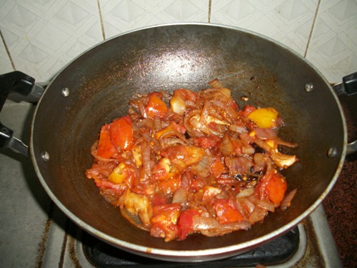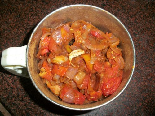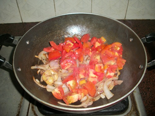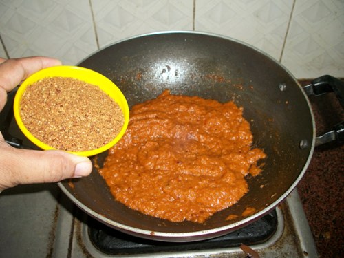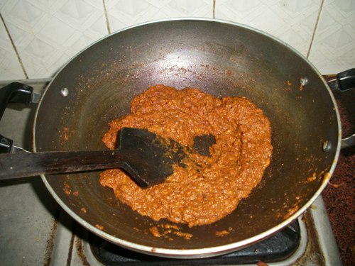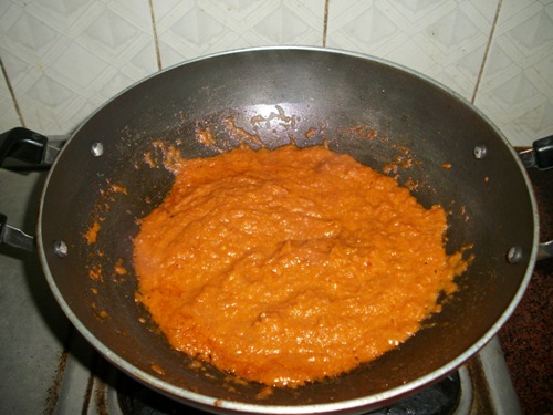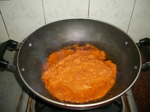 - Now add in tomato puree and blend well. Cook that till oil separates.