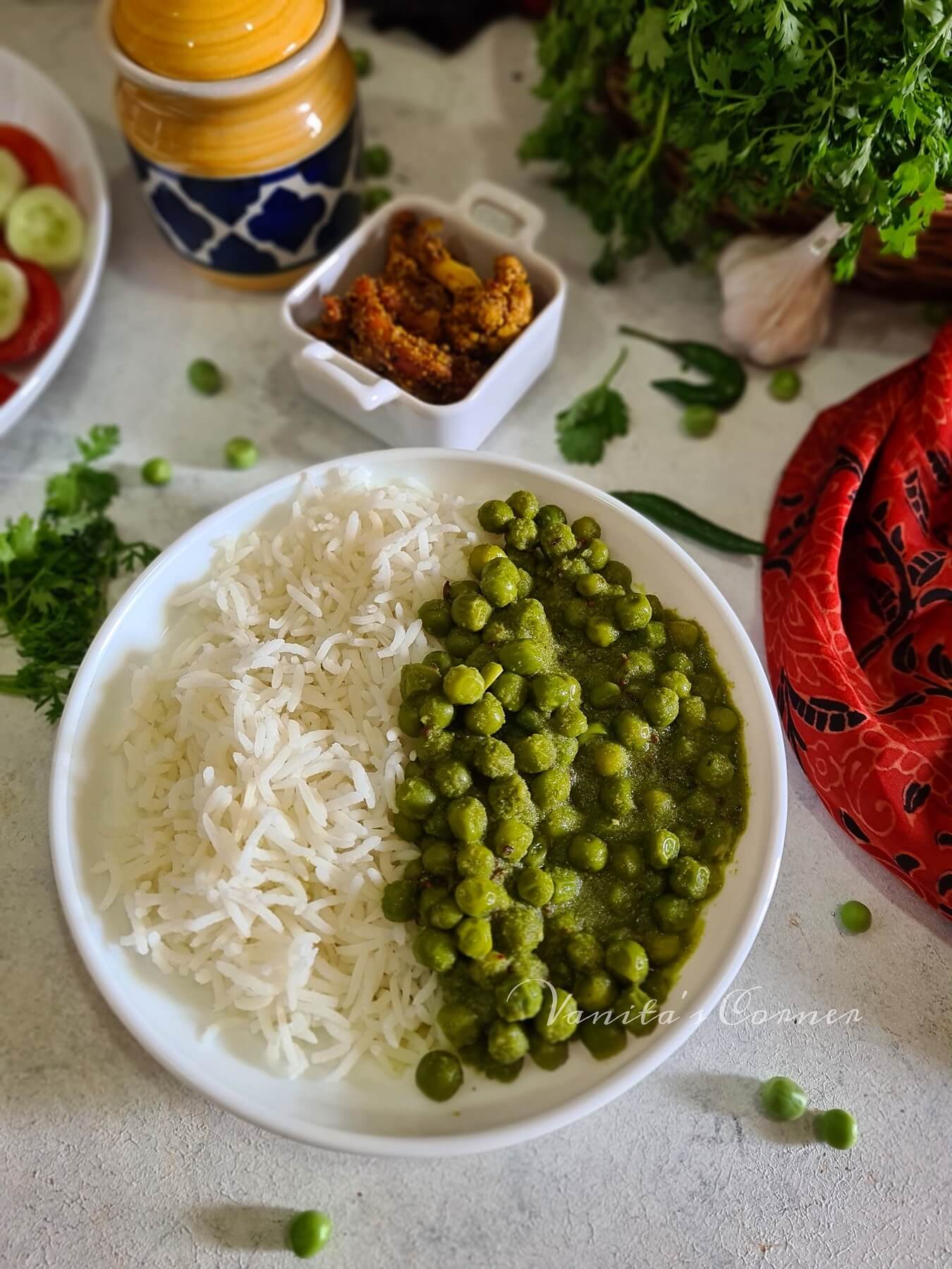 Green Peas curry – fresh winter peas cooked in a spicy, green gravy.