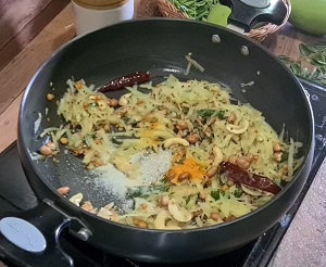 For tempering : oil, curry leaves, mustard seeds, chana dal, udad dal, hing, dry red chillies,green chillies, peanuts and cashew nuts.