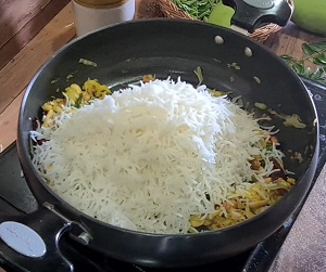 Now, add cooked rice and provides a mild mix, taking care not to interrupt the rice.