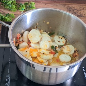 Add 2 cups of water, ½ tsp turmeric powder and salt.