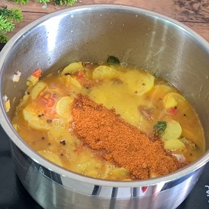 Now, add a small piece of jaggery, salt as required and a few water to regulate the consistency of the sambar.