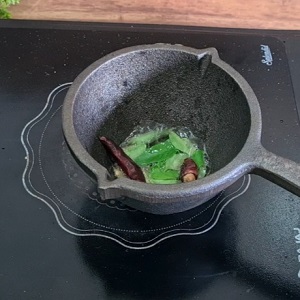 Tempering : oil, mustard seeds, udad dal, curry leaves, dry red chillies
