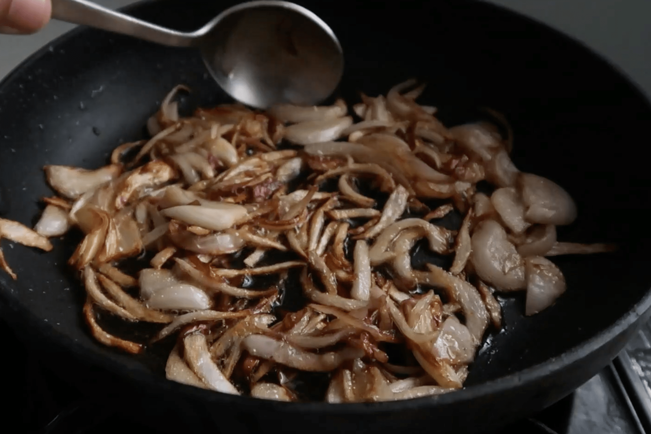 4)Add in sliced onions and fry till golden brown. Add in green chillies.