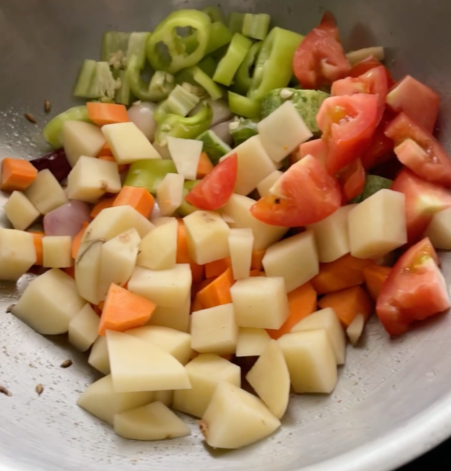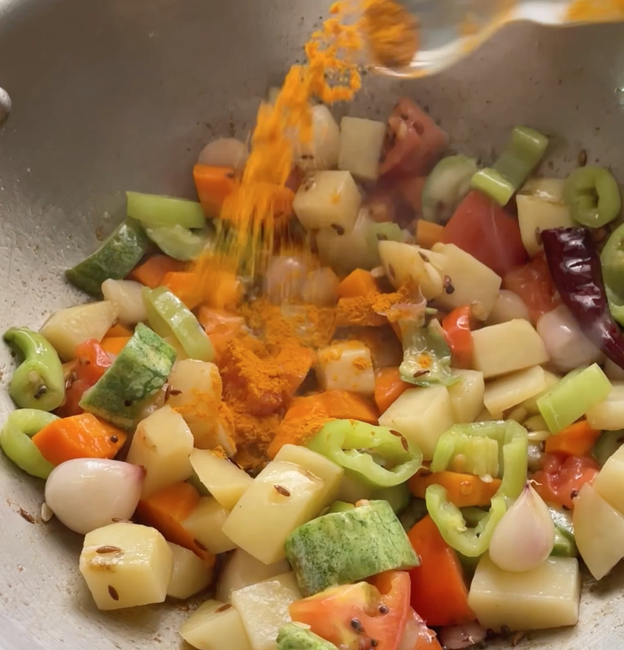 Heat oil in a pressure cooker, add within the tempering ingredients and saute for a min. Now add in onions, tomatoes and toss well. Cook them for five mins. Add in salt, sugar and all of the spice powders and saute them for a min. Now add in all of the veggies and toss well with the masala. Cook them for five to 10 mins till the raw smell leaves from them.