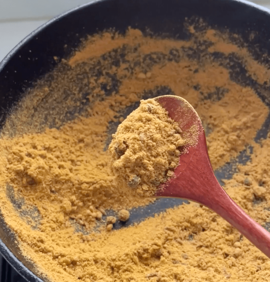 • Heat a pan. add within the roasting ingredients one after the other and toast till golden. Remove to a blender and powder it.