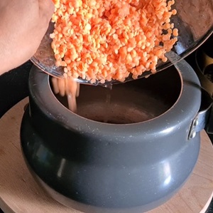 Drain the water and transfer to a pressure cooker. Add 1 ½ cups of water. Add 1 tsp turmeric powder and salt. Pressurecook for 3 to 4 whistles. Keep cooked dal aside.