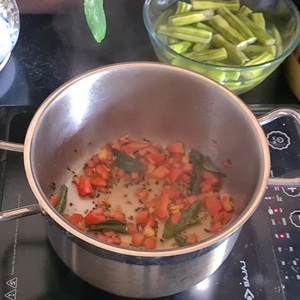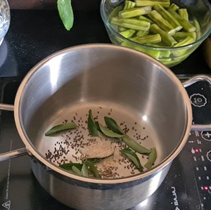 When the seeds start crackling, add cumin seeds, curry leaves, asafoetida and saute for few seconds.