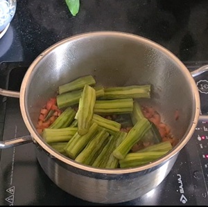 Add chopped drumsticks, ½ tsp turmeric powder and blend well. Add around ½ cup water an cook covered till the drumstick is cooked.