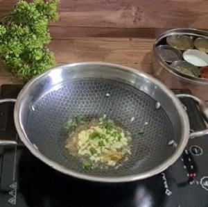 Add chopped garlic, crushed ginger and chopped green chillies. Saute for few seconds.