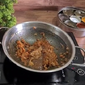 Add chopped onions. Add a pinch of salt and saute till the onion turns golden brown in color.