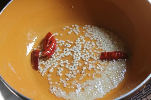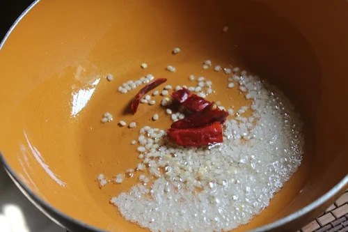 - Heat 1 tsp oil in a pan, add in urad dal and chillies and saute till golden.