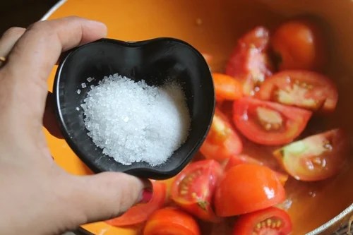 - Now add in tomatoes, salt and sugar and blend well. Cover and simmer the pan and cook for five to 10 mins. Now it’s cooked. Take this in a blender and puree till smooth.