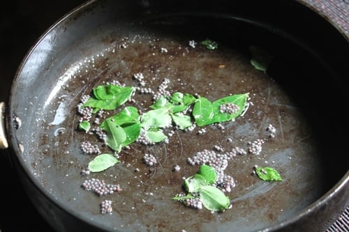- Now make seasoning, heat oil in a pan, add in mustard seeds, hing, curry leaves and blend well.