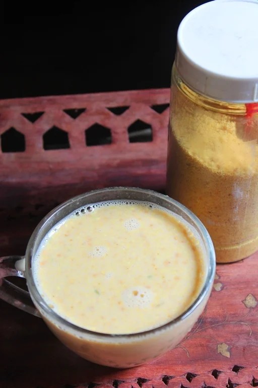 Badam milk powder mix is made using roasted blanched almonds, sugar, saffron, cardamom. I used palm candy also often called panangkarkandu on this recipe. But you should use regular sugar or palm sugar too. A pinch of turmeric on this mix helps with the healing advantages.