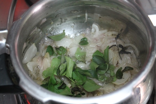 8)I used a pressure cooker to make the curry. You should use an everyday kadai or cooking pot. Heat generous amount of oil within the pressure cooker. Add in sliced onions and saute till light golden.
