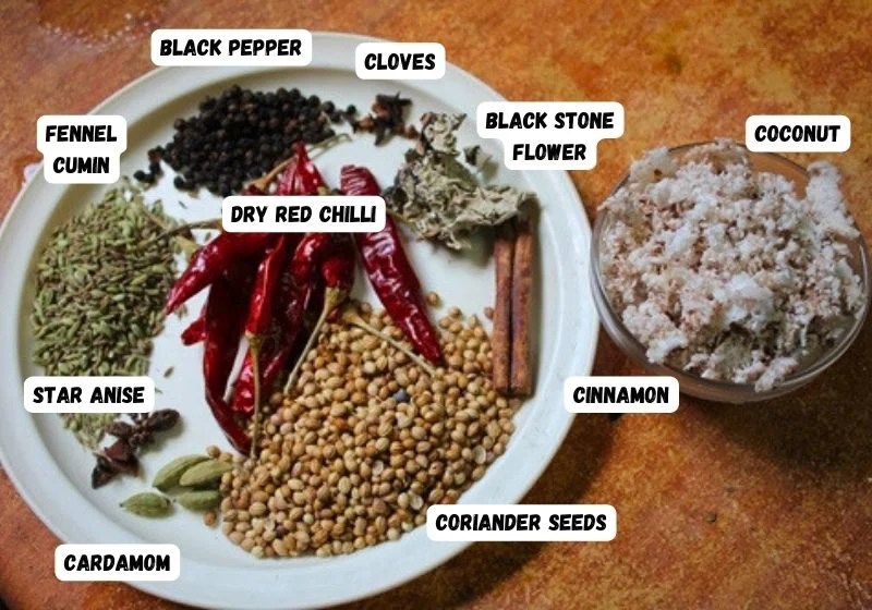 chettinad cuisine has numerous spices like red chillies, kalpasi, coconut, coriander seeds, cumin seeds, fennel seeds, black pepper, onions, ginger, garlic and gingelly oil.