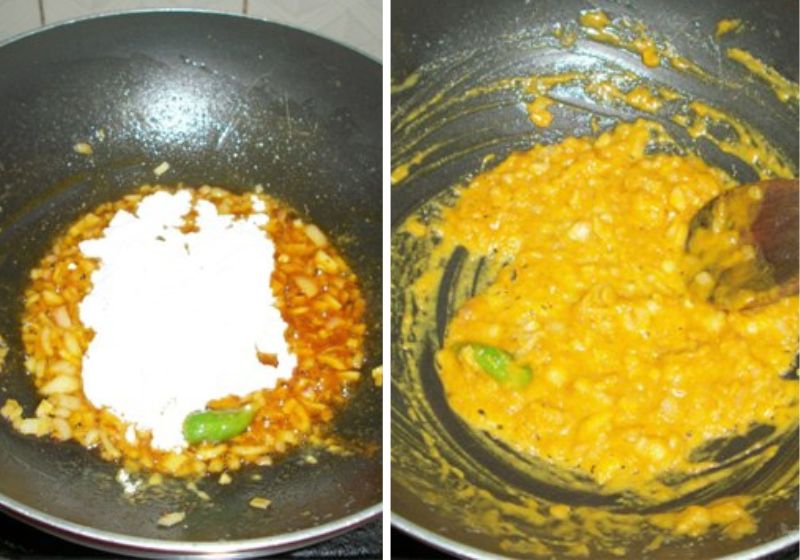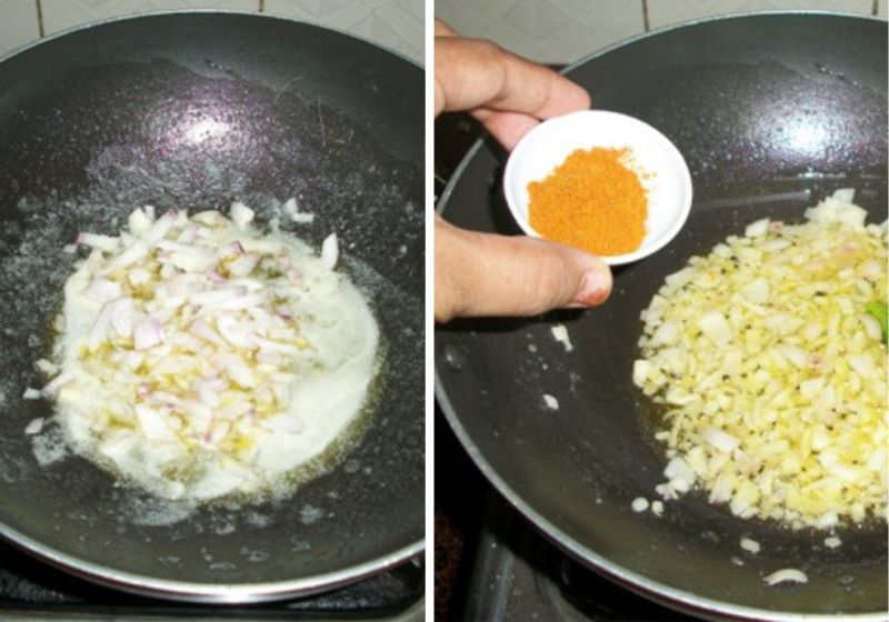 1)Heat butter in a kadai. Add in chopped onions, green chillies and saute for two minute. Add in curry powder into the sauted onion and blend well.