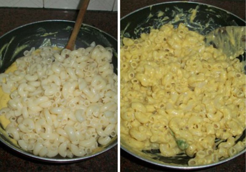 8)Now add in cooked macaroni and blend well. Thats it, your creamy mac and cheese is able to serve.