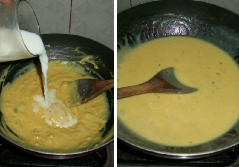 3)Pour milk slowly while mixing consistently. The sauce will thicken and gets a yellow shade from the curry powder.