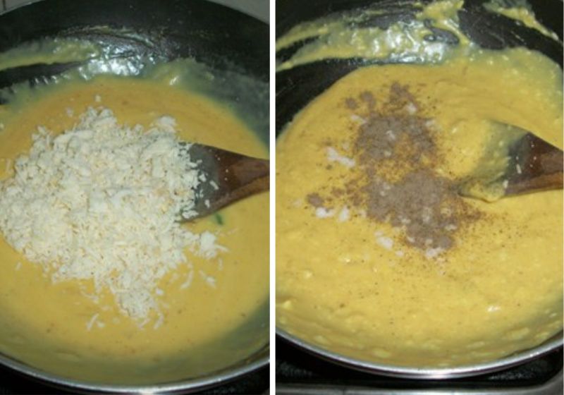 4)Add in grated cheese, salt and pepper and blend well. Your curried mac and cheese sauce is prepared.