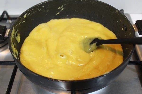 14)At one point the mixture might be thick and starts to go away the perimeters of the pan like this. It will take around 5 minutes of cooking.