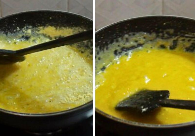The method starts with roasting gram flour in ghee till fragrant. In a separate pan we heat ghee till it’s super hot. Now for mysore pa, we cook sugar syrup till one string consistency. Now sprinkle roasted gram flour within the sugar syrup and blend till smooth.