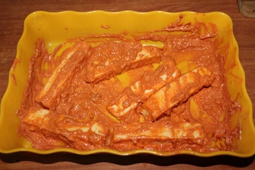 7)Coat it well within the yogurt spice mix. You’ll be able to marinate it for 10 mins or overnight.
