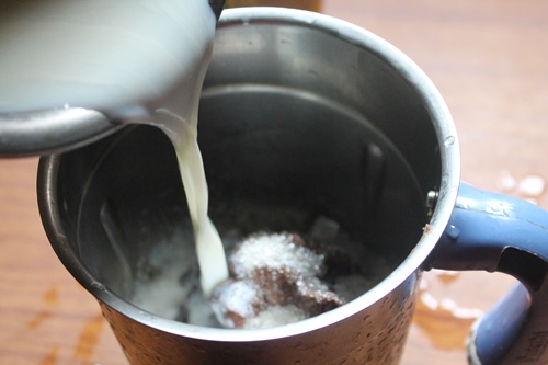 7)Pour in cold milk. As an alternative of normal milk you need to use almond milk, soy milk or oat milk.