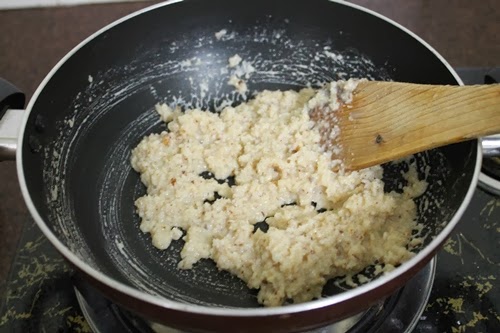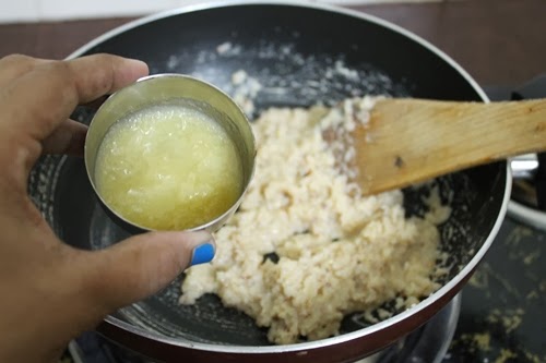 7)Add ghee little at a time and cook till it comes together.