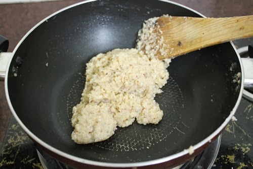 1)Heat ghee or butter in a pan. Add finely chopped nuts and fry till nuts get light golden.
