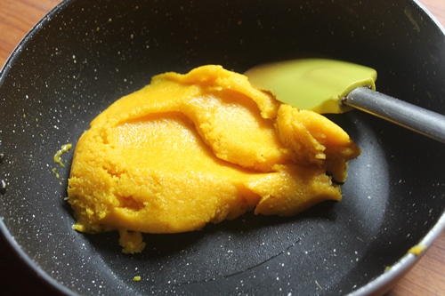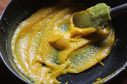 2)Add in saffron or yellow food color and cook till the sugar melts.