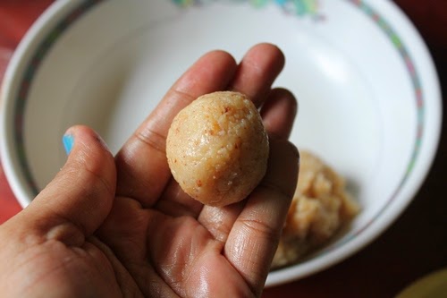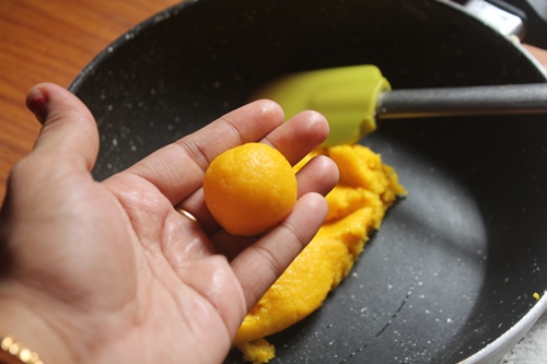 5)Shape the mixture into small balls and roll into ladoo.