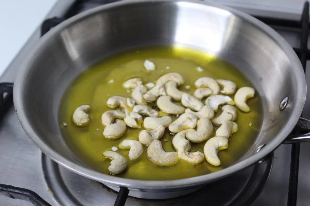 - Take a kadai and add ghee in it. Add cashews, kishmish and cardamom in it and blend well. Fry till cashews turn light golden.