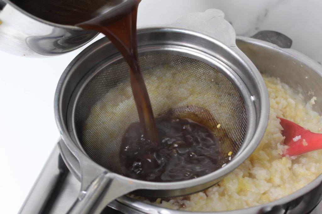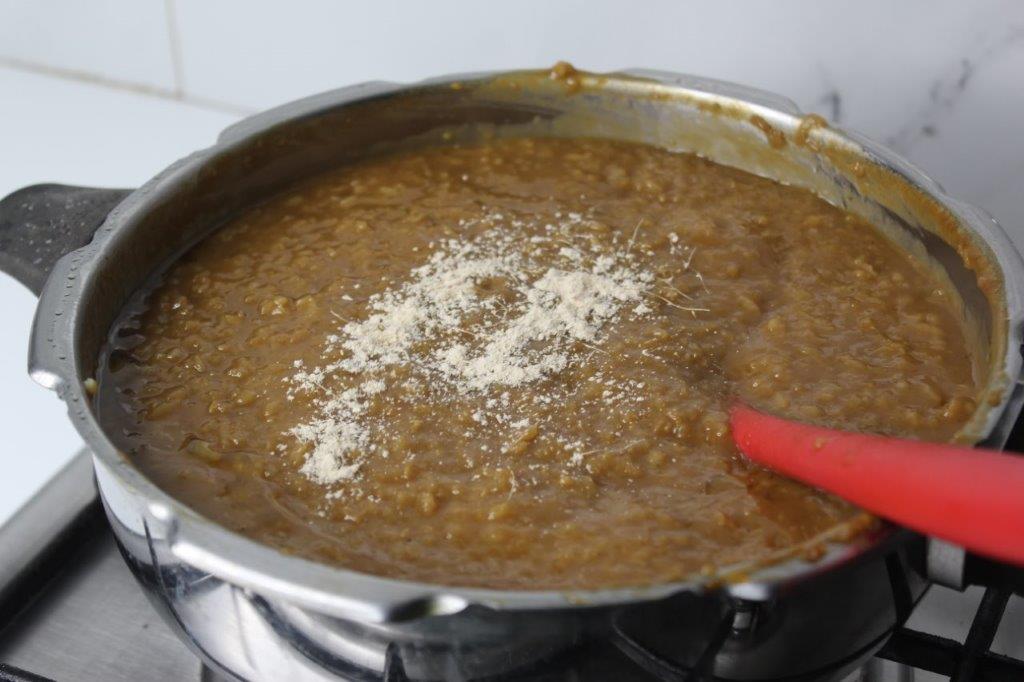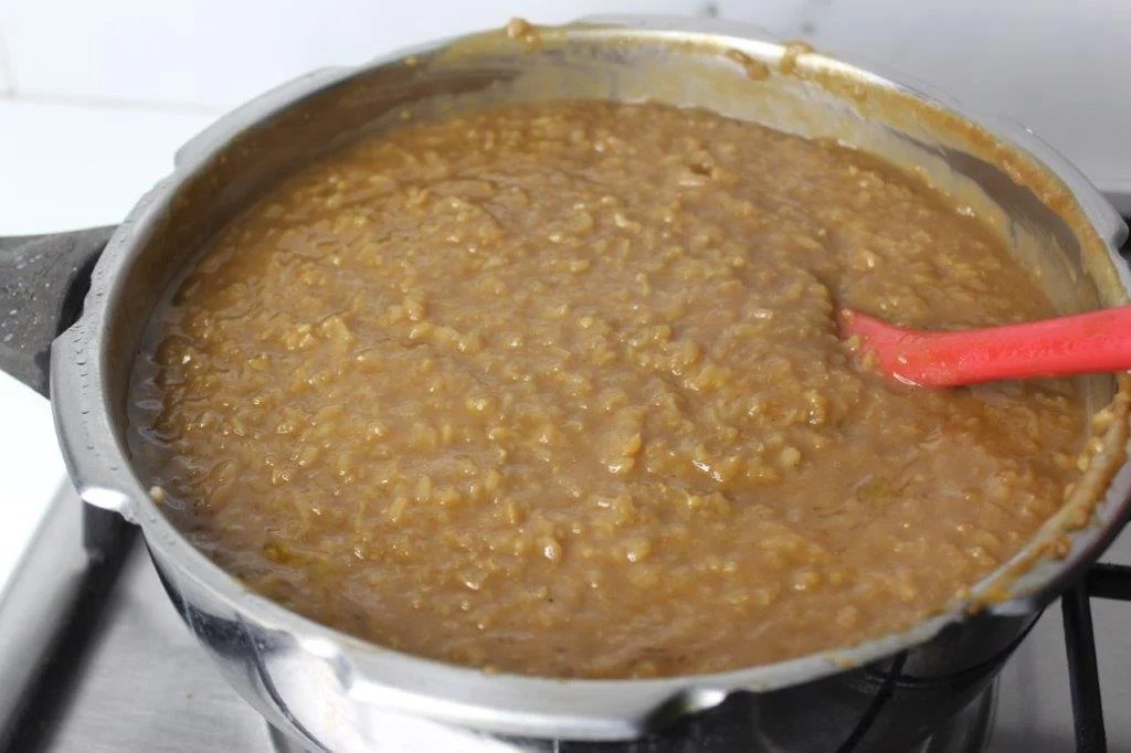 - Meanwhile add 1 cup of water to jaggery and blend well, in order that it gets dissolved. Pour this jaggery water over the cooked rice and dal through a sieve and blend well.